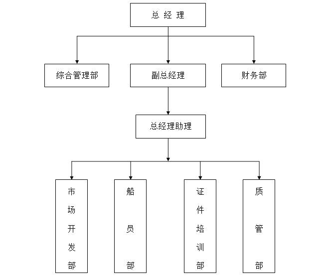 公司為了更好服務(wù)于船員和航運企業(yè)、相關(guān)合作單位等,廈門海盈海運特設(shè)立了總經(jīng)理直轄管理的副總經(jīng)理( 崗位)及綜合管理部、財務(wù)部等,同時設(shè)立總經(jīng)理——副總經(jīng)理——總經(jīng)理助理順序垂直管理的四個職能 部門:市場開發(fā)部、船員部、證件培訓(xùn)部、質(zhì)管部,為船員服務(wù)管理業(yè)務(wù)和其他業(yè)務(wù)提供有力的人力資 源和對口崗位保障。組織機構(gòu)圖如下:
